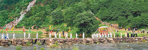 1000년의 신비를 간직한 충북 진천군 문백면 농다리(籠橋)에서 지난달 30일 상여 메고 농다리 건너기 행사가 진행되고 있다. 문백면 구곡리 굴티마을 앞 세금천에 돌로 쌓은 농다리는 동양 최고(最古)의 다리로 알려져 있다. 길이 93.6m, 너비 3.6m, 두께 1.2m, 교각 폭 80cm로 고려 때 만들어진 것으로 추정된다. 진천군 제공