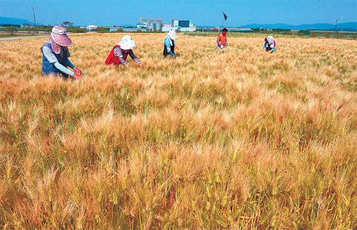 망종(芒種·6일)을 앞둔 2일 충북도농업기술원의 연구용 밭에서 직원들이 영글어 가고 있는 겉보리와 영양보리의 영양 상태를 살피고 있다. 예전에는 이맘때를 ‘보릿고개’라고도 불렀지만 지금은 옛말이 됐다. 지금은 보리가 기능성 식품으로 각광받고 있다. 충북도 제공