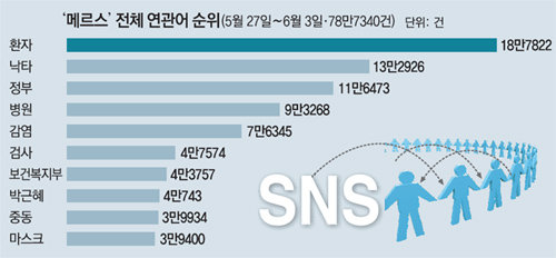 3위에는 정부(11만6473건)가 올라 메르스 확산의 책임을 물었고, 4위는 병원(9만3268건), 5위는 감염(7만6345건)이 차지했다. 또 카카오톡 등에서는 메르스 확진 환자 병원 리스트가 퍼지기도 했으나 대부분 사실과 다른 것으로 알려졌다. 일종의 유언비어인 셈인데 정부의 정보 통제가 이들의 확산을 가중시켰다. 이와 관련해 새누리당 유승민 원내대표와 하태경 의원 등은 감염 지역, 감염자 명단, 병원 등의 공개를 검토할 필요가 있다고 주장했다. 6, 7, 8위에는 검사, 보건복지부, 박근혜 대통령이 올랐고 9위는 메르스 진원지인 중동이, 10위는 품절 사태를 맞고 있는 마스크가 차지했다.