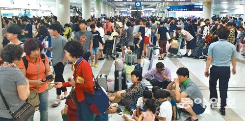 12일 9호 태풍 ‘찬홈’의 영향으로 제주도에 폭우가 내리면서 제주공항 항공편 100여 편이 결항돼 관광객 2000여 명의 발이 묶였다. 이날 오후 제주공항 이용객들이 청사에서 비행기가 뜨길 기다리고 있다. 이번 비는 13일 밤 강원 영서지방을 제외한 대부분의 지역에서 그치겠다.