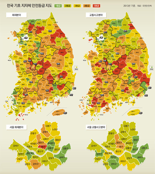 전국 시군구 가운데 서울 송파구와 강동구,부산 기장군, 경기 수원시와 부천시, 충북 증평군 등 6곳이 화재·교통 분야에서 상대적으로 안전한 지역으로 나타났다. 반면 부산 중구, 대구 동구, 경북 영천·상주시 등 7곳은 두 항목 모두 최하 등급을 받았다.