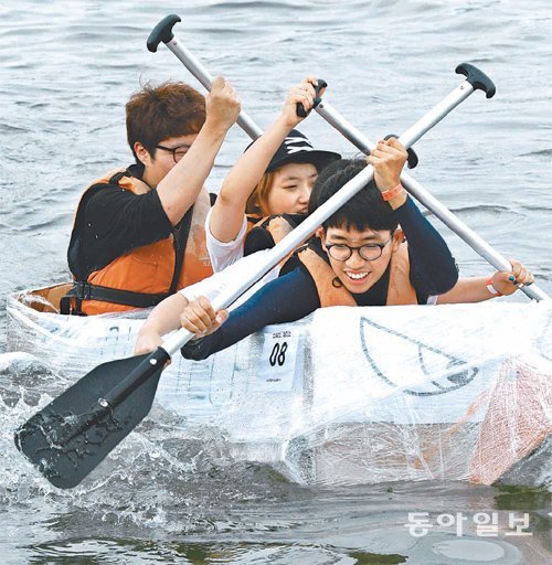 2일 서울 송파구 잠실한강공원에서 열린 ‘한강박스원레이스’ 참가자들이 종이보트에 올라타 힘차게 노를 젓고 있다. 이 행사는 참가자들이 재활용 종이박스 등 주변에서 찾기 쉬운 재료로 직접 배를 만들어 한강을 건너는 경주대회로 9일까지 계속된다.