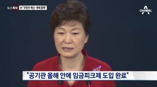 박근혜 대통령은 6일 대국민담화를 통해 “정년 연장을 하되 임금은 조금씩 양보하는 임금피크제를 도입해서, 청년 일자리를 더 많이 만들 수 있도록 해야 한다”며 “금년 중으로 전 공공기관의 임금피크제 도입을 완료하겠다”고 밝혔다.