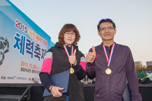 28일 서울 송파구 올림픽공원에서 열린 ‘체력왕중왕 선발대회(문화체육관광부 국민체육진흥공단 공동 주최)’. 박래철 씨(60·대전)와 이명주 씨(42·경남 창원)가 악력테스트와 제자리멀리뛰기, 10m 왕복달리기, 윗몸일으키기, 앉아 윗몸 앞으로 굽히기, 20m 셔틀런 등 6개 종목에서 겨루는 체력테스트에서 문체부 장관상을 받았다.