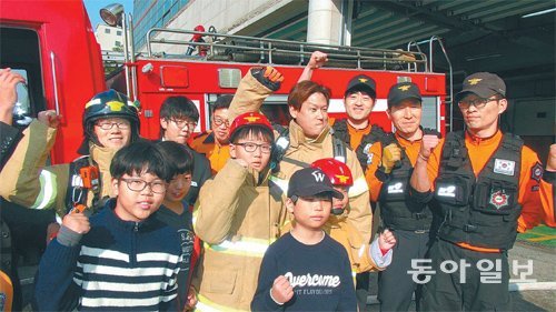 세계 10대 과학자로 인정받는 데니스 홍 교수(뒷줄 오른쪽에서 네 번째)가 4일 인천 서부소방서에서 어린이들과 소방관 일일체험을 한 뒤 파이팅을 외치고 있다. 김영국 동아닷컴 객원기자 press82@donga.com