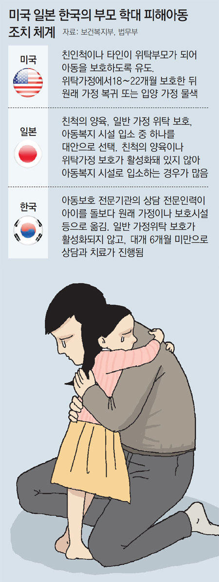 영미권 국가에서는 부모로부터 학대 받은 아이들이 18∼22개월 정도 위탁가정에 맡겨져 ‘평범한 가정생활’을 하면서 사회성과 자존감 등을 회복하도록 한다. 또는 부모가 양육할 수 없는 상황이라면 입양이나 자립 등을 돕는다. 정경운 국립서울병원 청소년정신과장은 “돌봄자가 오랜 기간 지속적으로 도움을 줘야 피해 아동의 회복 속도나 치료 효과도 좋다”며 “국내에서도 많은 가정이 위탁가정에 참여하도록 독려하고, 정부나 관련 기관은 이들이 제 역할을 할 수 있도록 체계적으로 교육시켜야 한다”고 말했다.