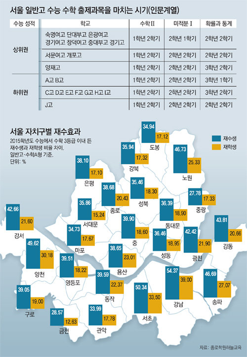 각 학교는 3년간 과목당 기본 단위는 모두 가르치는 것이기 때문에 해당 과목을 늦게 마치거나 반복 학습을 안 한다고 문제 삼을 수는 없다. 그러나 학교에서 충실히 가르쳐 학원에 가지 않아도 되는 것과 학교 공부만으로는 수능 대비가 잘되지 않는 것에는 분명히 큰 차이가 있다. 전문가들은 수능 하위권 학교라고 수업 수준을 무조건 낮추면 안 된다고 지적한다. 전 한양대 입학처장 배영찬 교수는 “강남 학생은 반복해 보는데 비강남권은 그렇지 않다면 출발부터 다른 것”이라며 “학생 능력별로 맞춤형 수업을 해야 하위권 학교의 공부 잘하는 학생이 사교육을 안 받아도 된다”고 말했다. 맞춤형 수업이 잘되면 좋은 교육을 받으려고 굳이 강남으로 이사하는 학생도 줄어들 수 있다는 얘기다. ○ 재수효과는 비강남권이 높아