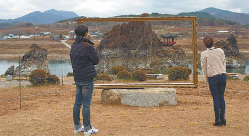 한폭의 그림처럼… 충북 단양 도담삼봉 앞에 설치된 대형 액자 조형물 앞에서 관광객들이 도담삼봉을 바라보고 있다. 단양군 제공