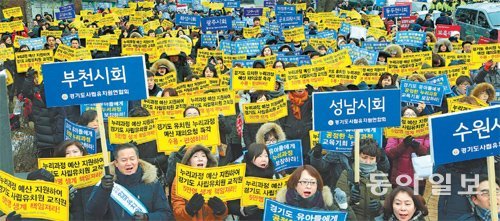한국유치원총연합회 경기지회 소속 유치원 원장과 교사 등 850여 명이 경기 수원시 경기도청 정문 앞에서 누리과정 예산 편성과 집행을 촉구하는 집회를 열고 있다.
