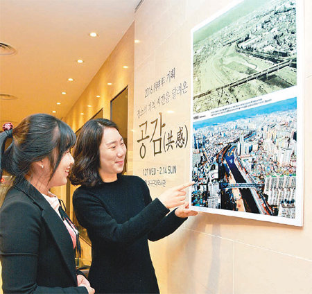 1일 대구백화점 프라자점 11층을 찾은 고객들이 1950년대 신천과 현재의 신천을 비교하는 사진을 감상하고 있다. 전시회는 14일까지 계속된다.