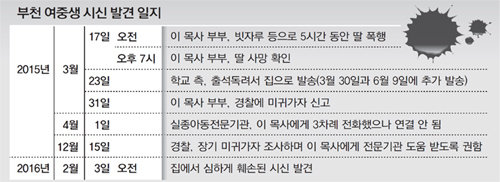 경기 부천소사경찰서는 3일 딸 이모 양(사망 당시 13세)을 폭행해 숨지게 한 혐의(폭행치사 등)로 목사인 아버지 이모 씨(47)와 부인 백모 씨(40)를 긴급체포했다. 백 씨는 숨진 딸의 계모다. 또 2년간 이 양을 데리고 있던 백 씨의 여동생(39)도 폭행 혐의로 긴급체포했다. 이 씨는 경찰 조사에서 “지난해 3월 17일 오전 7시부터 5시간 동안 집에서 이 양을 빗자루 등으로 때렸는데 같은 날 오후 7시경 죽어있는 것을 발견했다”고 진술했다.