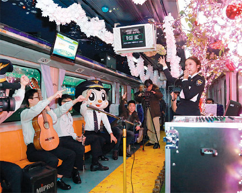 경북지방경찰청 직원들이 동대구와 청도를 오가는 불빛관광열차에서 4대악 범죄를 예방하고 효과적인 대응방법을 알려주고 있다. 경북경찰청은 상반기까지 관광테마열차에서 퀴즈와 게임 형식으로 정책 홍보를 실시할 예정이다.