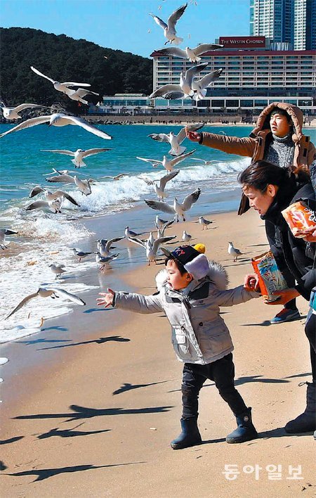 설 연휴 마지막 날인 10일 부산 해운대해수욕장을 찾은 나들이객들이 갈매기에게 먹이를 주며 설맞이로 분주했던 심신을 달래고 있다.