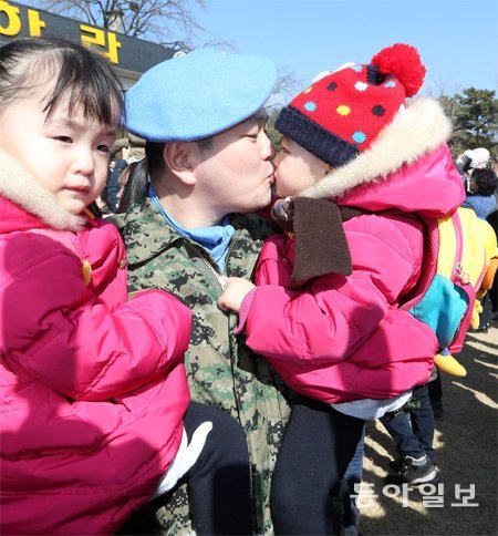 23일 서울 특수전사령부에서 열린 아프리카 남수단 재건 지원 파병부대인 한빛부대 6진 환송식에서 박종관 대위가 쌍둥이 딸과 입을 맞추며 인사하고 있다. 한빛부대는 유엔의 요청에 따라 2013년 3월부터 파병돼 내전 후유증을 앓고 있는 남수단 재건 지원 임무를 수행하고 있다.