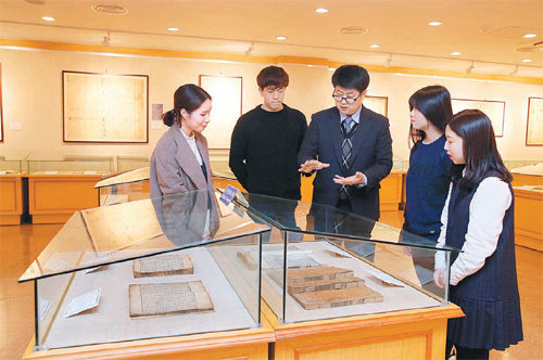 23일 계명대 동산도서관 7층 고문헌실을 찾은 학생들이 최근 국가 문화재로 지정된 퇴계선생문집(보물 1894호) 등을 보고 있다. 이 도서관은 문화재청이 역옹패설, 익재난고 등 옛 문헌 3종 26권을 보물로 추가 지정해 현재 21종 93권을 소장하고 있다.
