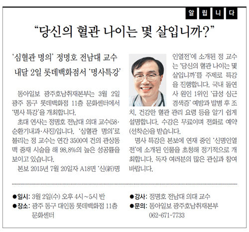 ‘심혈관 명의’ 정명호 전남대 교수, 3월 2일 롯데백화점서 ‘명사특강’