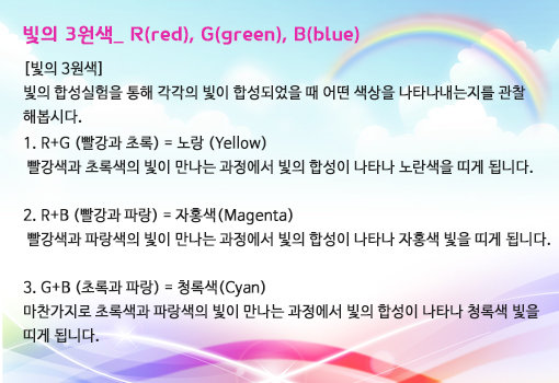 이를 통해 우리는 일상생활에서 다양한 색들을 만날 수 있게 되는데, 다양한 색상을 표현하기 위해 꼭 프리즘에서 보았던 일곱 가지의 무지개색상이 필요한 것은 아닙니다. 미술시간에 만나보았던 색의 세계에서도 모든 색깔을 만들어 낼 수 있는 기본색인 삼원색이 있듯이 빛 또한 모든 색깔의 빛을 만들어낼 수 있는 3원색의 빛이 존재합니다. 바로 빨강(Red), 초록(Green), 파랑(Blue), RGB 컬러가 그것입니다.