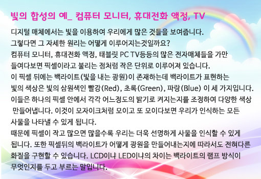 디지털 매체에서는 빛을 이용하여 우리에게 많은 것들을 보여줍니다. 그렇다면 그 자세한 원리는 어떻게 이루어지는것일까요?