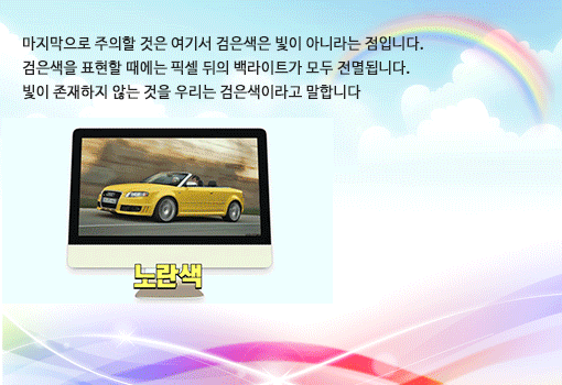 마지막으로 주의할 것은 여기서 검은색은 빛이 아니라는 점입니다. 검은색을 표현할 때에는 픽셀 뒤의 백라이트가 모두 전멸됩니다. 빛이 존재하지 않는 것을 우리는 검은색이라고 말합니다.