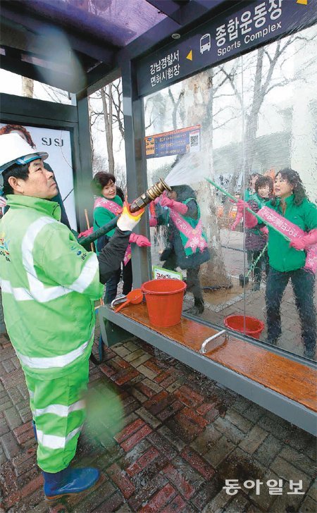 서울 송파구 주민과 공무원들이 3일 송파구 지하철 9호선 종합운동장역 인근 버스정류장을 깨끗이 청소하고 있다. 송파구는 3월 말까지를 봄맞이 대청소 기간으로 정하고 동별로 도로 교통시설물과 이면도로의 염화칼슘 잔재 등을 청소할 예정이다.