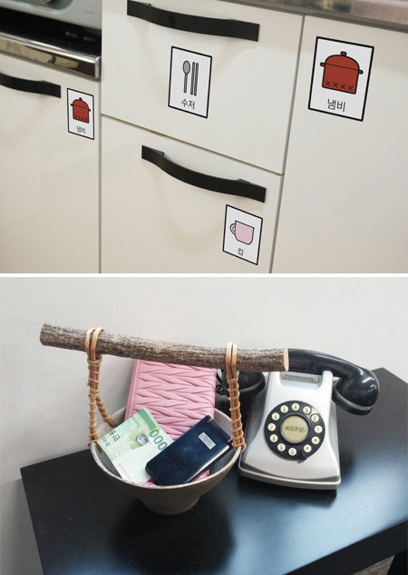 집 안 찬장과 서랍장에는 손바닥만 한 크기의 스티커가 여러 장 붙어 있었다. 스티커마다 ‘수건’ ‘수저’ ‘침구’라는 글씨와 그림이 인쇄돼 있다. 물건을 쉽게 찾을 수 있고 있던 자리를 금방 잊지 않게 하는 효과가 있다.