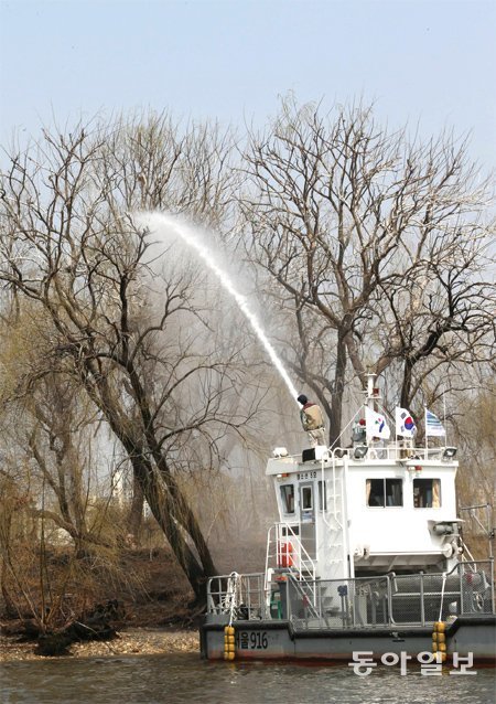 22일 서울 한강 밤섬에서 봄맞이 대청소에 나선 서울시 한강사업본부 직원들이 새싹이 잘 돋아날 수 있도록 버드나무 가지에 쌓인 민물가마우지 등의 배설물을 씻어 내고 있다.