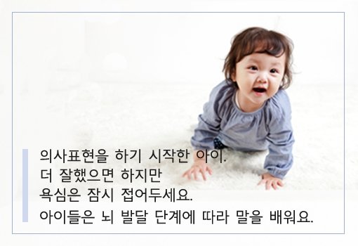 그러던 지유가 24개월을 넘어서면서부터 ‘물 줘’ ‘물 차워’하며 짧지만 의사표현을 하기 시작했다. 지유와 대화가 된다고 느낄 때마다 엄마는 ‘처음부터 이랬다면 얼마나 좋았을까’라고 생각했다. 하지만 그건 엄마 욕심이다. 아이들은 뇌발달 단계에 따라 차근차근 말을 배우기 때문이다.