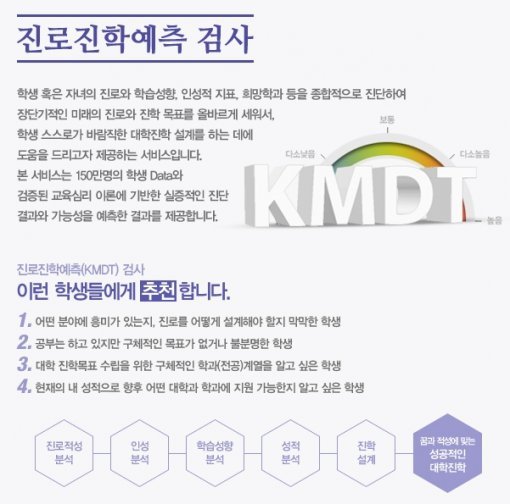 진학사는 150만 명의 학생 데이터와 검증된 교육심리 이론에 기반한 실증적인 진단 결과를 제시하는 온라인 진로진학예측(KMDT)검사를 4월 이벤트 기간 내에 구매하면 1회 더 진단을 받을 수 있는 ‘진로진학예측검사 더블(1+1) 이벤트’를 30일까지 진행한다. 최근 자유학기제 전면 도입에 따라 진로 교육에 대한 중요성이 높아지면서 학생의 올바른 진로 진단에 대한 학부모들의 관심도 높아지고 있다. 진학사의 KMDT검사는 학생의 진로와 학습성향, 인성적 지표, 희망학과 등을 종합적으로 진단하는 것이 특징. 이를 통해 학생의 장단기적인 진로와 진학 목표를 올바르게 세워 학생 스스로가 바람직한 대학진학 설계를 할 수 있도록 구성했다. 30일까지 진학사의 온라인 KMDT검사를 진학사 홈페이지에서 구매하면 기한 없이 원하는 시기에 추가로 한 번 더 검사를 받을 수 있다. 검사를 마친 후 결과를 온라인상에서 바로 확인할 수 있고, 출력도 가능하다.