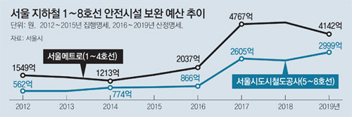 27일 동아일보가 입수한 서울메트로(1∼4호선)와 서울도시철도공사(5∼8호선) 자료에 따르면 올해부터 2019년까지 지하철 안전시설 재구축에 각각 1조5855억 원과 8953억 원 등 2조4808억 원이 필요한 것으로 추산됐다.