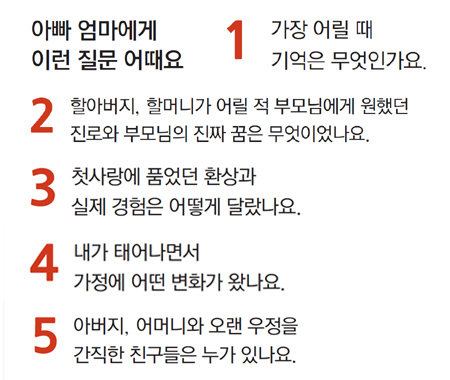 한국의 보통 부모와 자녀는 일주일에 1시간 정도밖에 대화하지 않는다. 소통 전문가들은 자녀가 부모 세대의 인생 이야기를 자서전으로 정리하는 것은 대화의 물꼬를 틀 수 있는 좋은 방법이라고 말한다.