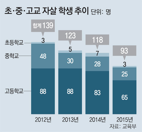 2000년대 학교폭력, 가정불화나 우울증 등으로 청소년의 자살이 늘어나면서 2009년 초중고교생 자살자는 202명까지 치솟았다. 그러나 2010년대 들어 학생 자살은 줄어드는 추세다. 2011년 150명이던 학생 자살자는 2012년 139명, 2013년 123명, 2014년 118명으로 감소했다. 지난해 교육부, 보건복지부, 여성가족부 등 관련 부처가 합동으로 ‘학생 자살 예방대책’을 적극 추진하면서 2015년 학생 자살자는 전년 대비 25명(22%)이 줄었다.