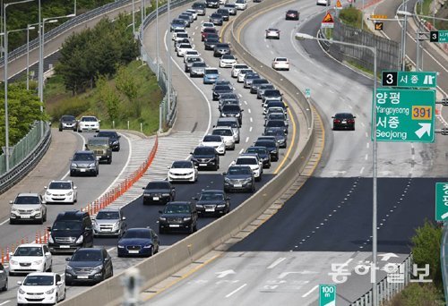 나흘간의 황금연휴 마지막 날인 8일 서울춘천고속도로에 귀경 차량이 한꺼번에 몰리면서 서울 방향 도로가 극심한 정체를 빚었다. 한국도로공사는 이날 하루 평소 일요일보다 9만 대가 많은 50만 대가 귀경한 것으로 추산했다.