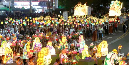 불기 2560년 부처님오신날을 일주일 앞둔 7일 밤 형형색색 불을 밝힌 연등 행렬이 서울 종로구 조계사로 향하고 있다. 지난달 20일 서울 종로구 광화문광장에서 봉축점등식을 연 것으로 막을 올린 연등회 행사(국가무형문화재 제122호)는 부처님오신날인 14일까지 계속된다.