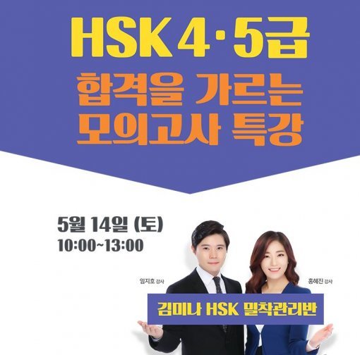 ‘김미나 HSK 밀착관리반’ 팀이 HSK 4․5급 실전 모의고사 특강을 진행한다. ‘김미나 HSK 밀착관리반’은 김미나 강사를 필두로 홍혜진, 임지호, 김재영 강사로 구성돼 HSK 4~6급을 노리는 학생들이 강사의 밀착 강의를 들을 수 있다.