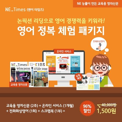 엔이 타임즈는 학생들의 눈높이에 맞춘 영문기사를 통해 독해와 어휘 실력을 기르고 풍부한 시사상식을 쌓을 수 있는 교육용 영자신문. 이번 영자신문 체험 패키지는 영자신문 2회분과 온라인 서비스 1개월, 전화화상영어 수업 1회로 구성된다. 초등생 대상의 엔이 타임즈 키즈와 중고생 대상의 엔이 타임즈 가운데 원하는 영자신문을 선택할 수 있으며 체험 패키지 구매 시 영자신문용 스크랩북 1부를 추가로 증정한다.