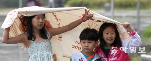일요일인 15일 화창했던 날씨가 갑자기 바뀌며 비가 내리자 서울 강북구 북서울꿈의숲을 찾은 어린이들이 담요를 뒤집어 쓴 채 비를 피하고 있다.