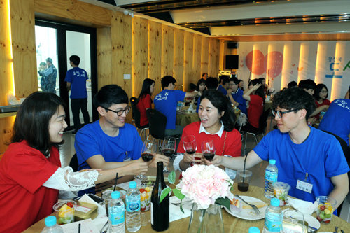 21일 경북 영천시 대창면 블루썸 와이너리에서 열린 청춘 남녀 즐거운 만남 행사에서 참가자들이 건배하고 있다. 영천시는 부부의 날인 이날 경북도와 영천시 직원 80명을 초청해 행사를 열었다. 영천시 제공