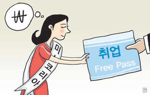 과거 미스코리아 타이틀이 연예인이 되는 지름길이었다면 최근엔 취업을 위한 ‘스펙’이 됐다. 특히 아나운서와 리포터, 승무원 등 외모가 경쟁력인 직종에서는 최고의 스펙으로 꼽힌다. 서울의 한 미용실 관계자는 29일 “6월 8일 열리는 미스코리아 서울지역 예선 참가자 10명 중 5명이 아나운서를 꿈꾸는 친구들”이라고 말했다. 대구의 한 미용실 원장은 “미인대회 타이틀이 취업에 큰 도움이 되기 때문에 인문계 학생이나 명문대 재학생의 참가도 늘고 있다”고 설명했다.