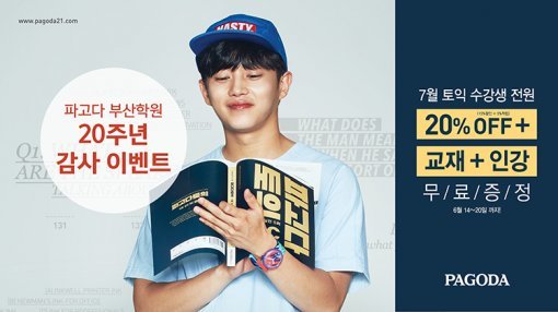 파고다 부산학원이 개원 20주년을 기념해 7월 수강 등록을 하는 고객들을 대상으로 다양한 혜택을 제공한다. 7월에 토익 과목을 등록하면 20% 할인 혜택을 제공하고, 이외 과목의 경우에는 10%를 할인해준다. 오는 14일(화)부터 20일(월)까지 7일간 부산 지역의 파고다학원 △서면점 △부산대점 △대연점 등 세 학원에 등록하면 누구나 혜택을 받을 수 있다.