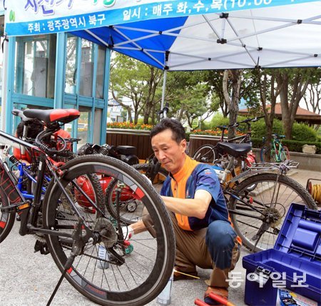 28일 광주 북구청 광장에 마련된 자전거 이동 수리센터에서 자원봉사자가 자전거 점검과 수리 봉사활동을 하고 있다.