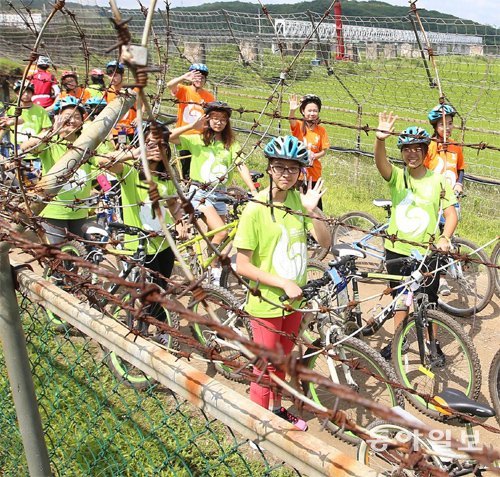 재외동포재단 주최로 열린 재외동포 청소년 DMZ 자전거 평화 대행진에 참가한 학생들이 18일 경기 파주시 임진각 철책을 지나며 손을 흔들고 있다.