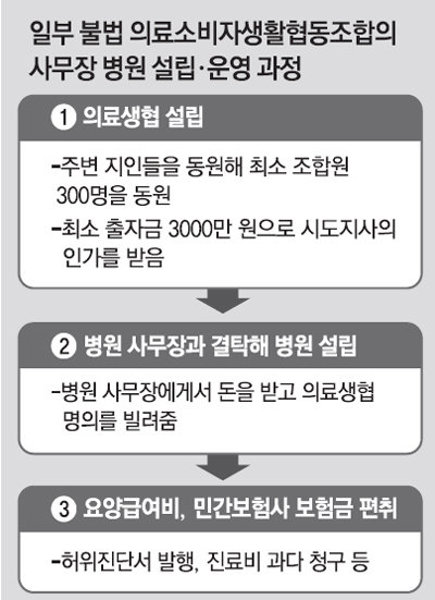 하지만 유령 의료생협을 설립하고 사무장 병원을 차린 뒤 환자를 모집하고 허위 진단서를 발행해 건강보험료와 보험금을 편취하는 사건이 계속되자 제도 자체를 손질해야 한다는 지적이 일고 있다. 의료생협 설립 인가 요건을 조합원 300명에서 500명으로 늘리고 출자금은 1억 원 이상으로 높여 설립을 비교적 까다롭게 하는 생협법 개정안이 이달 말부터 시행되지만 근본적인 대책이 될지는 미지수다.