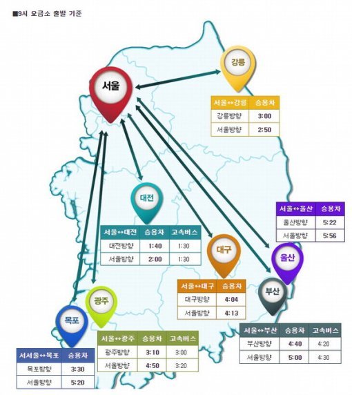 또 부산에서 오전 10시∼오후 2시 사이 출발하면 가장 극심한 정체를 만나 서울까지 6시간 이상이 걸릴 것으로 보인다.