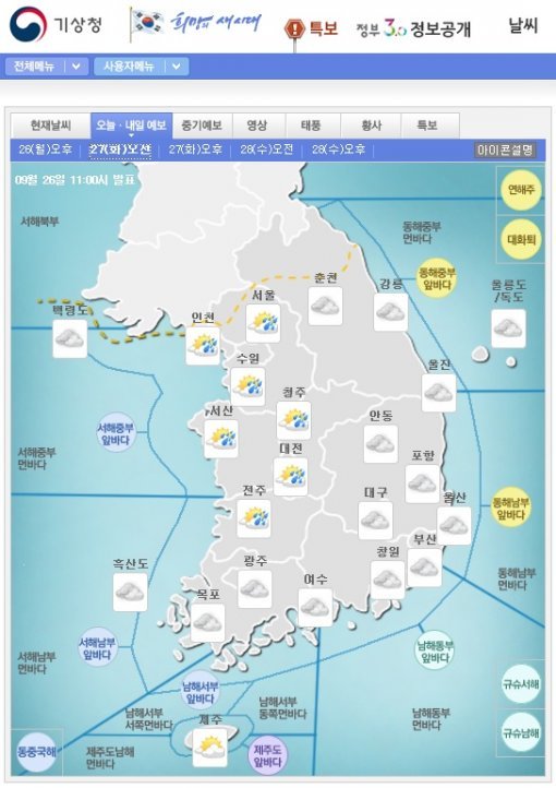 기상청은 26일 공식 홈페이지를 통해 “현재 서울·경기도는 대체로 맑고, 그 밖의 중부지방은 구름이 많은 가운데, 남부지방은 대체로 흐리고, 남해안을 중심으로 약하게 비가 오는 곳이 있다”고 전했다.