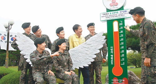 제1야전군사령부 내에 설치된 ‘천사운동 사랑의 행복온도탑’. 경제적으로 어려운 6·25전쟁 참전용사와 장병들을 돕기 위한 것으로 천사운동 목표 인원인 정기 후원자 4만 명을 100도로 환산했다. 제1야전군사령부 제공