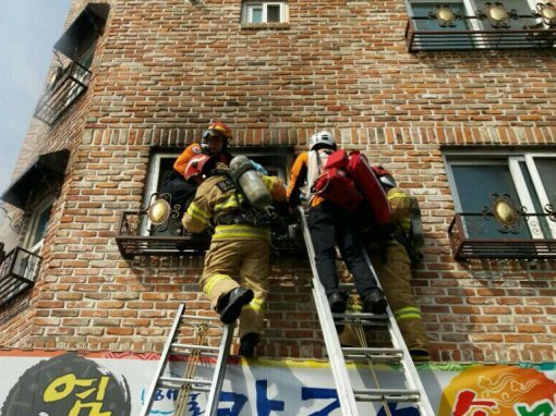 아래층에서 식당을 운영하는 김기운 씨(51)는 A 씨의 목소리를 듣고 밖으로 뛰어나왔다. 창문에서는 이미 시커먼 연기가 솟구치고 있는 다급한 상황이었다. 김 씨는 서둘러 외벽에 설치된 우수관을 타고 2층으로 올라갔다. 길을 지나던 다른 남성도 우수관을 타고 구조에 동참했다. 2층에 올라가 식당 간판 윗부분을 밟고 간신히 지탱한 두 사람은 A 씨가 창문 밖으로 나와 작은 철제 구조물에 걸터앉을 수 있도록 도왔다. 잠시 후 119 구조대가 도착했을 때 A 씨는 정신을 잃어 김 씨 등 두 사람이 추락을 막기 위해 A 씨를 붙잡고 있는 상태였다. 구조대는 사다리를 통해 A 씨를 아래로 끌어내린 뒤 병원으로 옮겼다.