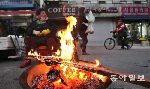 몸 녹이는 상인 올가을 들어 처음으로 영하권 날씨를 보인 1일 서울 중구 중림시장에서 한 상인이 몸을 녹이기 위해 피운 모닥불이 활활 타오르고 있다. 이날 서울의 아침 최저기온은 영하 2도까지 떨어졌다. 변영욱 기자 cut@donga.com