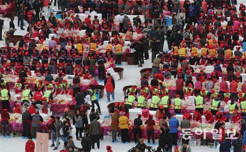4일 서울시청 앞 서울광장에서 열린 제3회 김장문화제에 시민 4000여 명이 참가해 김치를 담그고 있다. 서울시가 주최한 이 행사는 6일까지 계속된다.