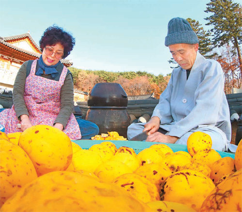 21일 경남 함양군 마천면 벽송사에서 스님과 신도가 모과차를 만들기 위해 정성들여 모과를 썰고 있다.