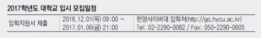 한양사이버대(http://go.hycu.ac.kr)의 정시모집 전형은 12월 1일부터 내년 1월 6일까지 이뤄진다. 온라인으로 자기소개서와 학업계획서를 제출하고 50분간 적성검사를 실시한다. 수능 점수는 불필요하다. 1차 추가모집은 내년 1월 18일부터 2월 14일까지다. 전형방법은 자기소개서 및 학업계획서 70점, 적성검사 30점을 합산한다. 입학(종합)성적 60점 미만자는 모집정원에 상관없이 불합격된다.